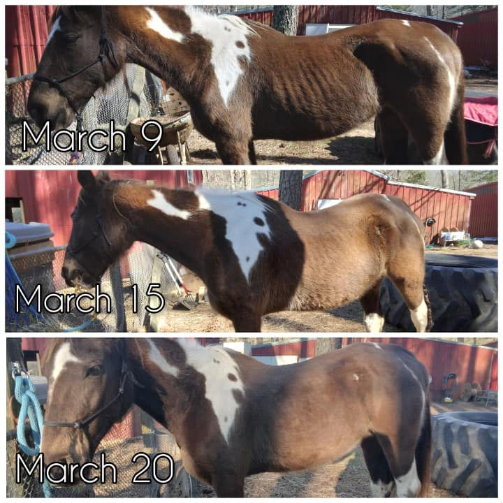 When I first purchased my mare in January, she was extremely underweight. It was difficult for me to add weight on without having any grass, due to a harsh winter. I remember thinking constantly how embarrassing it was to have people over. All they would see was an underweight, muddy horse (she loves to roll!). I also remember thinking often that it was taking so long to build her up. If I could tell you one thing about adding weight to a horse, it would be to NOT rush the process! Though it took me many months, my mare is now thriving and even has developed a little hay belly (which I need to fix!). The best help for putting on her weight, was her feeding routine. She would get 1/2 scoop Purina Senior feed with 1 scoop of soaked beet pulp in the morning, and 1/2 scoop of Purina feed in the evening. Along with 24 hour access to hay. I would not recommend allowing your horse 24 hour access to hay unless your vet approves the horse, some horses have trouble managing sugar (causing founder) and may need supplements to balance the hay sugars. If your horse is struggling significantly with putting on weight, I would recommend contacting a vet, worming the horse (if they have not yet been wormed, and/or adding beet pulp or alfalfa to their feeding routine!